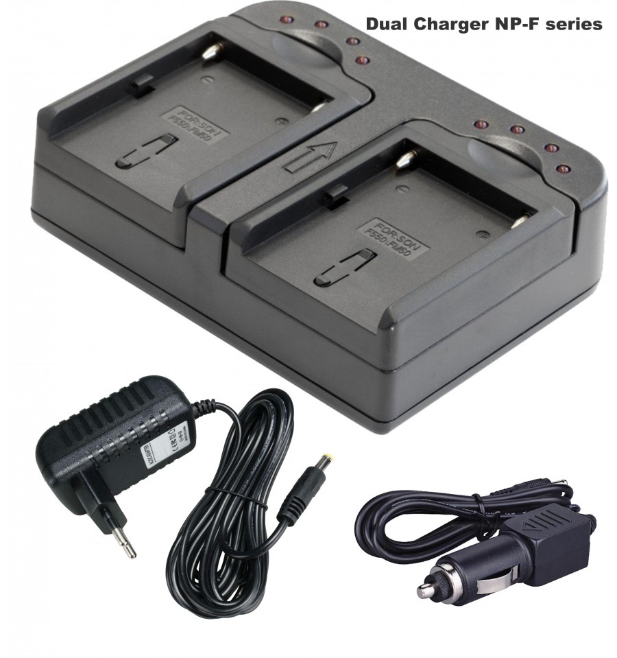 Dubbele Lader voor 2x Li-ion batterijen NP-F550/750/960 met autoadapter en voedingskabel